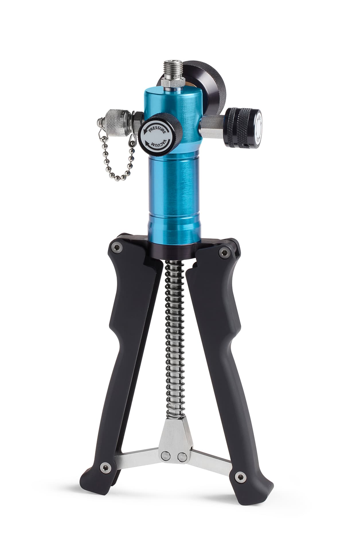 650 psi (4.5 Mpa) pressure / -28.5 inHg (-97 kPa) vacuum hand pump, 2 Quick-test outlet ports, 3 ft hose, 1/4" MNPT gauge conn., 1/4" MNPT Process conn.