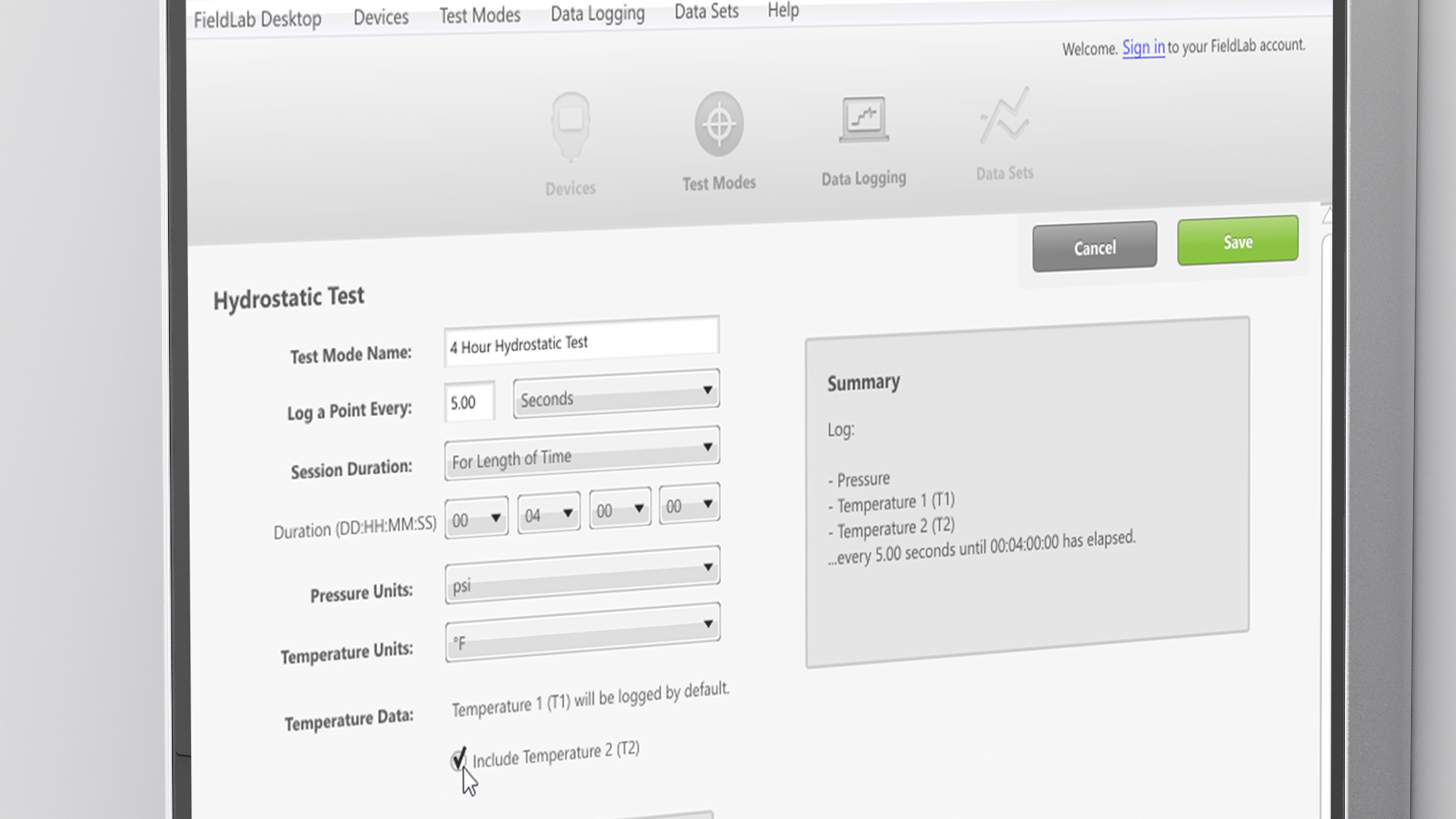 No more fumbling around with cables and dried out felt tip pens. Our ultra-portable FieldLab hydrostatic test kits include everything you need to set up and monitor tests digitally - a huge improvement over large, cumbersome chart recorders. Log media temperature, ambient temperature, and system pressure without wires at customizable intervals and download the results on your PC to easily create reports.