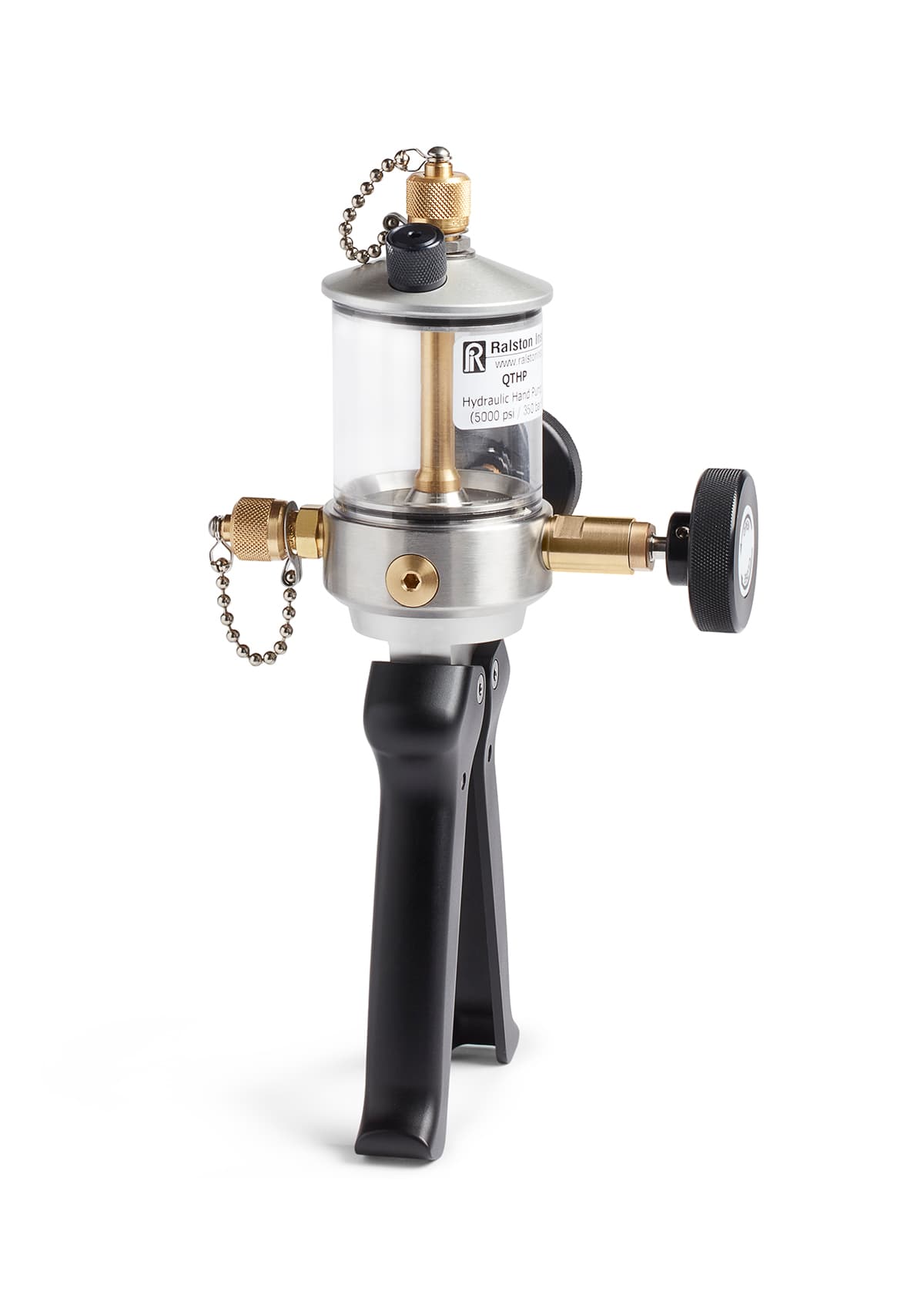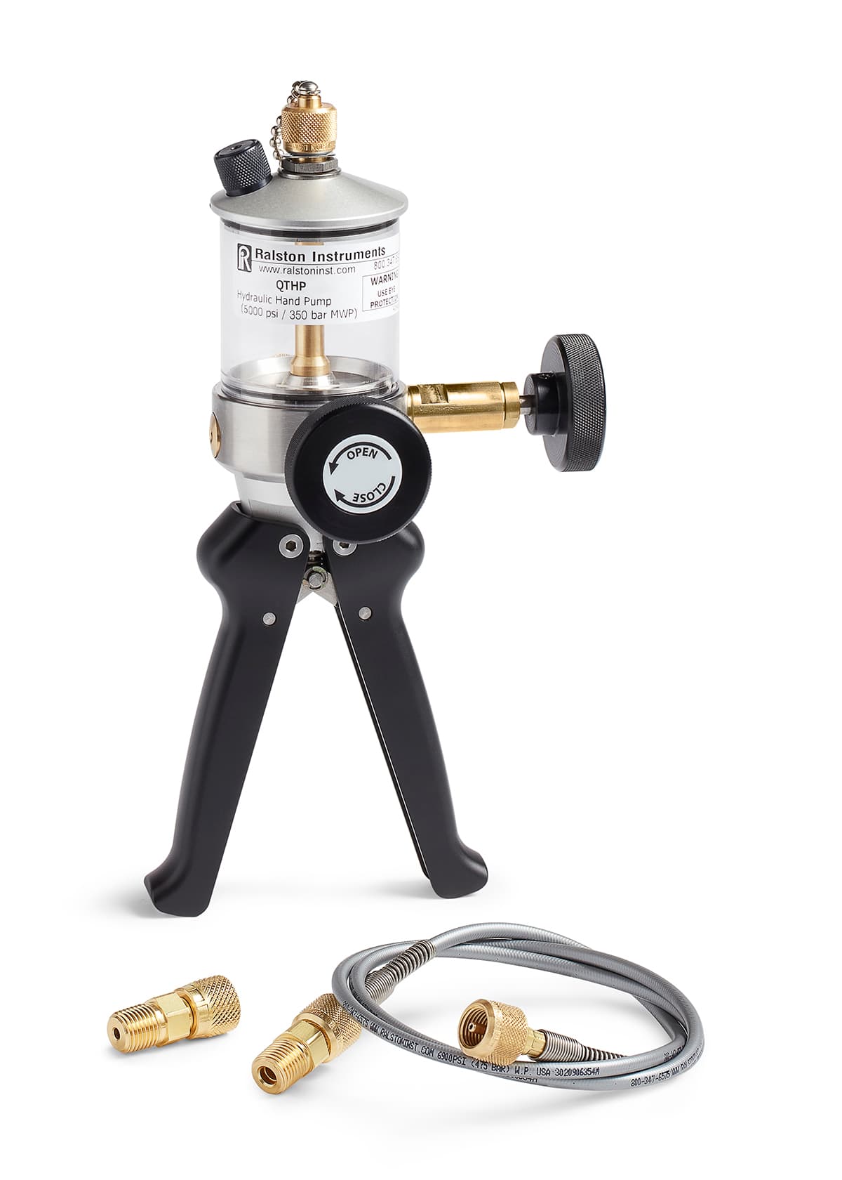 5kpsi / 35 MPa Hydraulic hand pump, 2 Quick-test outlet ports, 3 ft hose, 1/4" MNPT gauge conn., 1/4" MNPT Process conn.