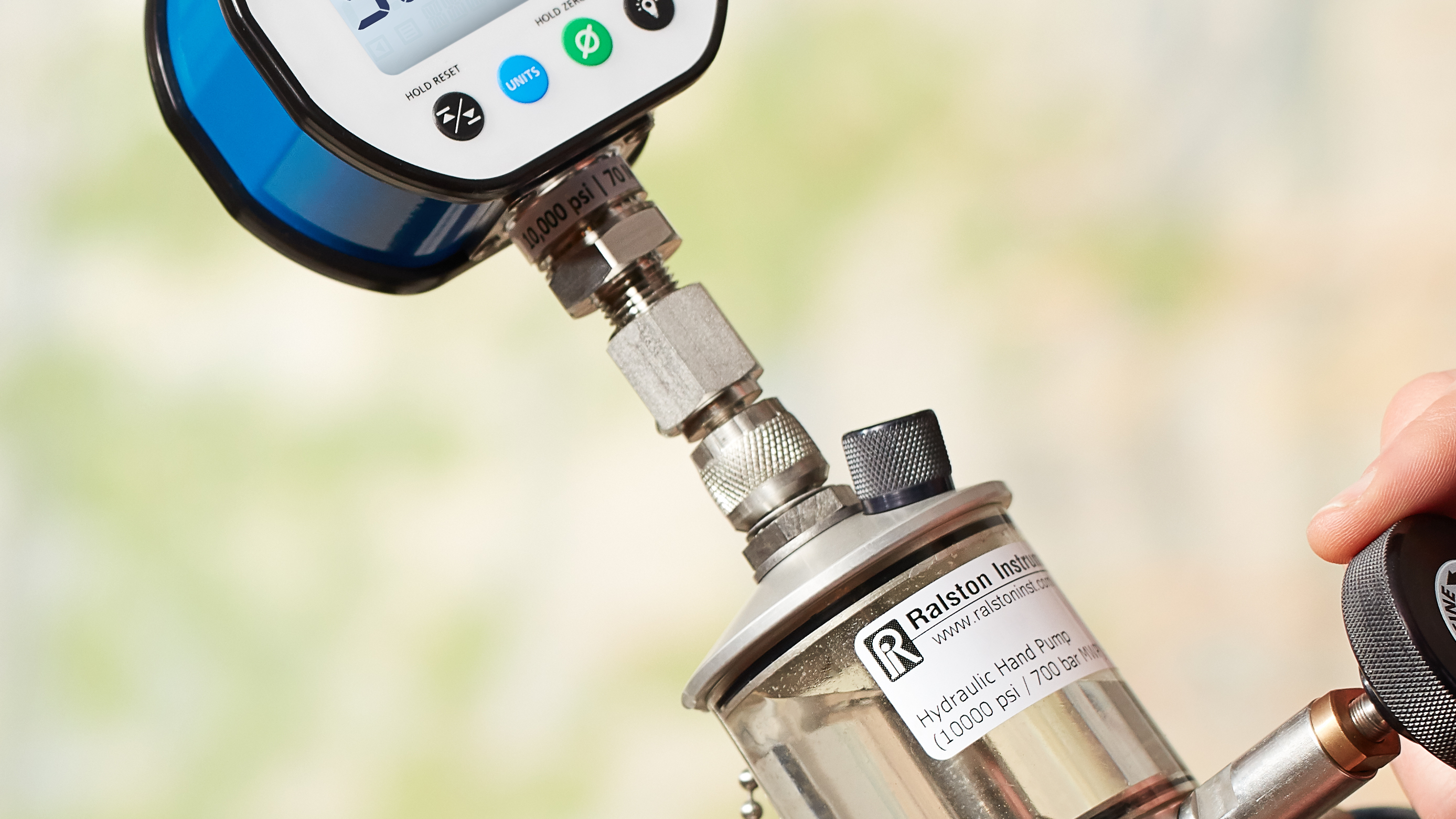 Connect Male NPT pressure gauge or other Male NPT device to a Ralston hand pump or nitrogen calibration device to create one side of a quick-disconnect to 10,000 psi