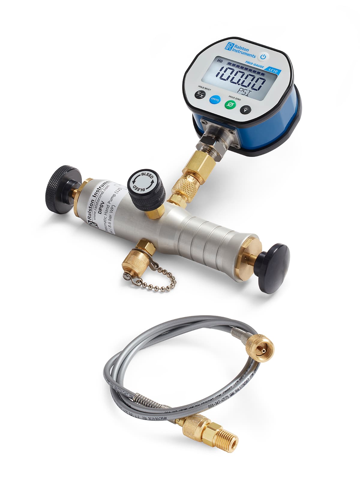 Pump and pressure gauge combination includes everything needed to perform accurate, precise low pressure calibrations