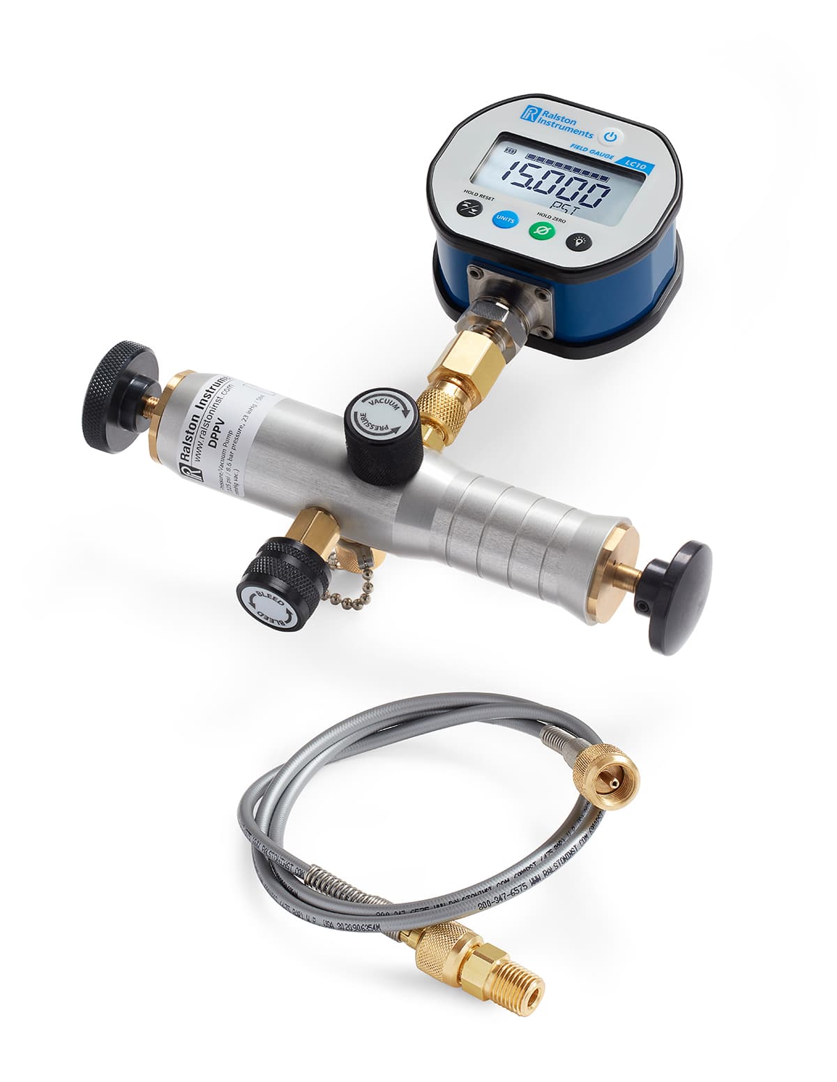 Kit consists of pressure and vacuum hand pump, compound pressure and vacuum gauge and all fittings required for calibration