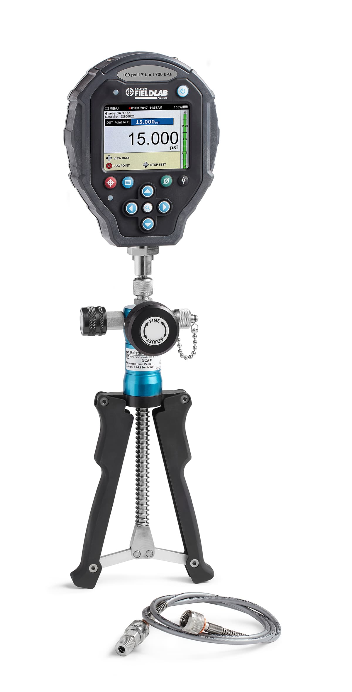 650 psi pneumatic hand pump, 1000 psi gauge (0.1% of reading accuracy), 3ft hose, process connection