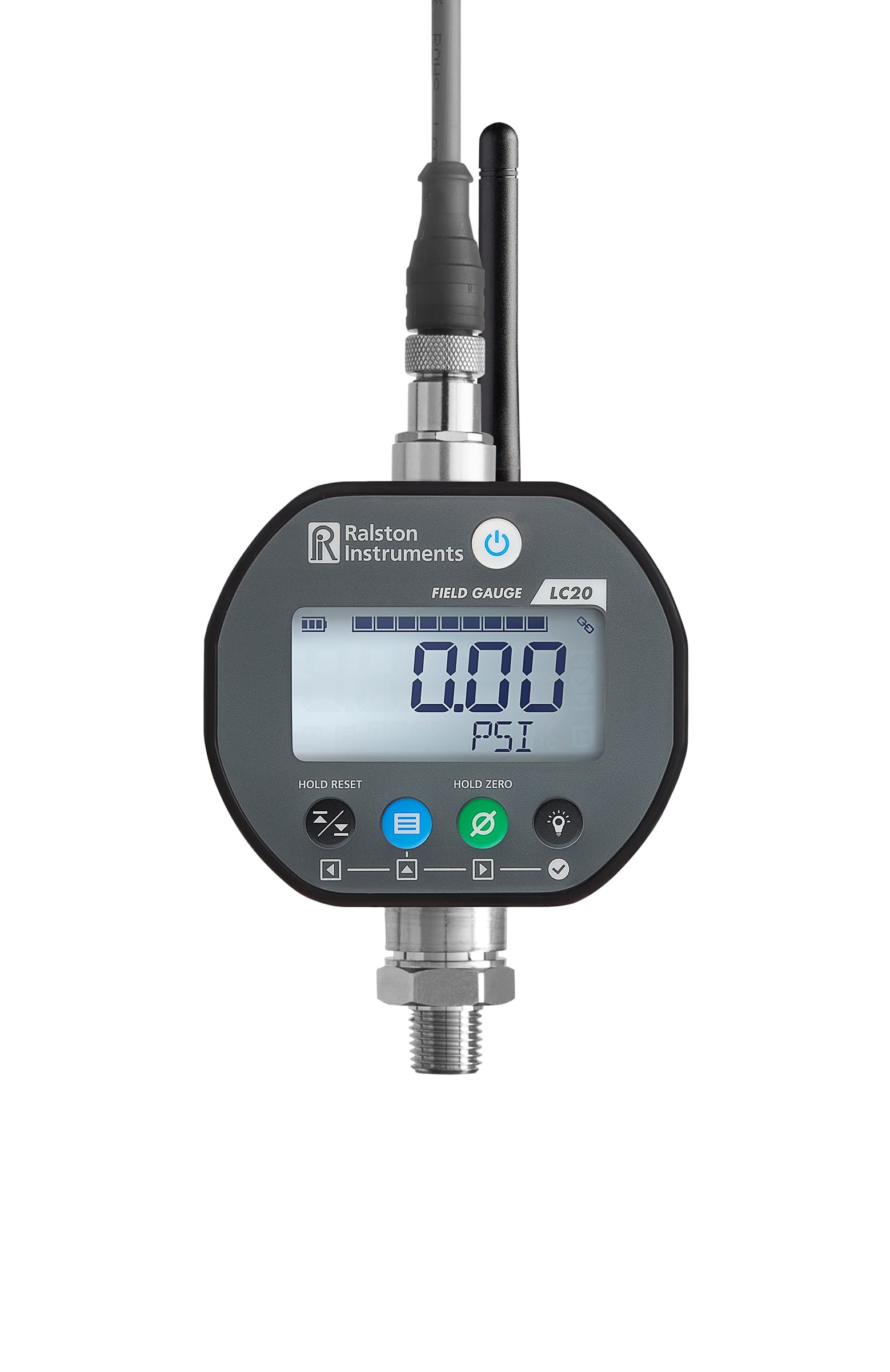 LC20 Pressure / temperature gauge, 3000 psi bottom connection, 1/4" MNPT, 1/4in Dia x 12in long thermal probe, 5 meter cable, Bluetooth radio