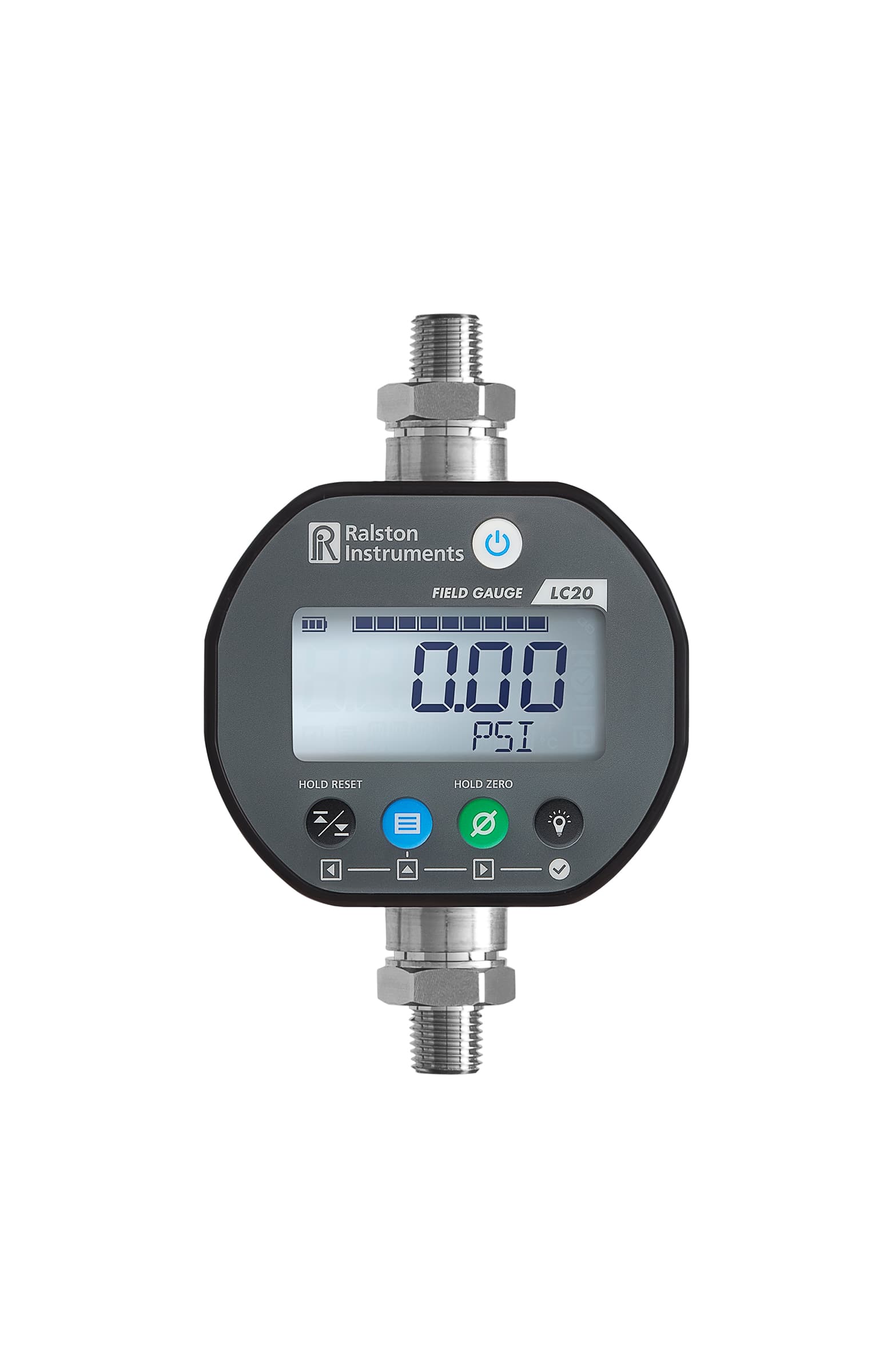 The LC20 is a robust device that measures and displays pressure readings on a large, backlighted screen. The LC20 has the ability to show High and Low pressure values on-screen, change between 15 different engineering units or add custom engineering units. The included PC FieldLab Desktop software can be used for calibration, testing and live viewing of pressure.
