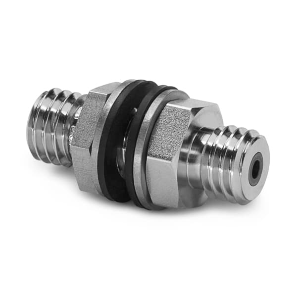 Excellent for safely connecting two Quick-test XT 10,000 psi hoses through an enclosure, truck, or panel wall