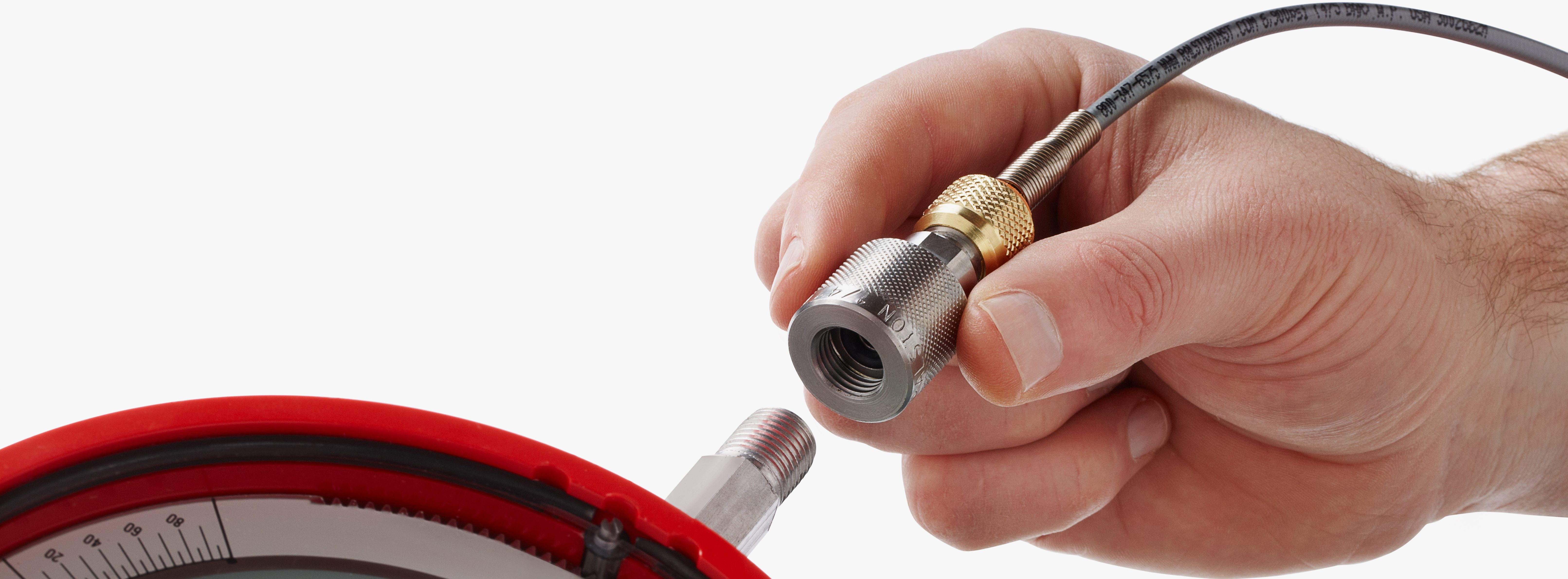 Low volume, quick connect high pressure hoses for pressure testing, calibration, and leak testing.