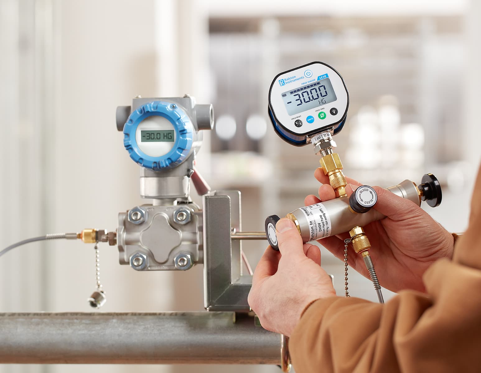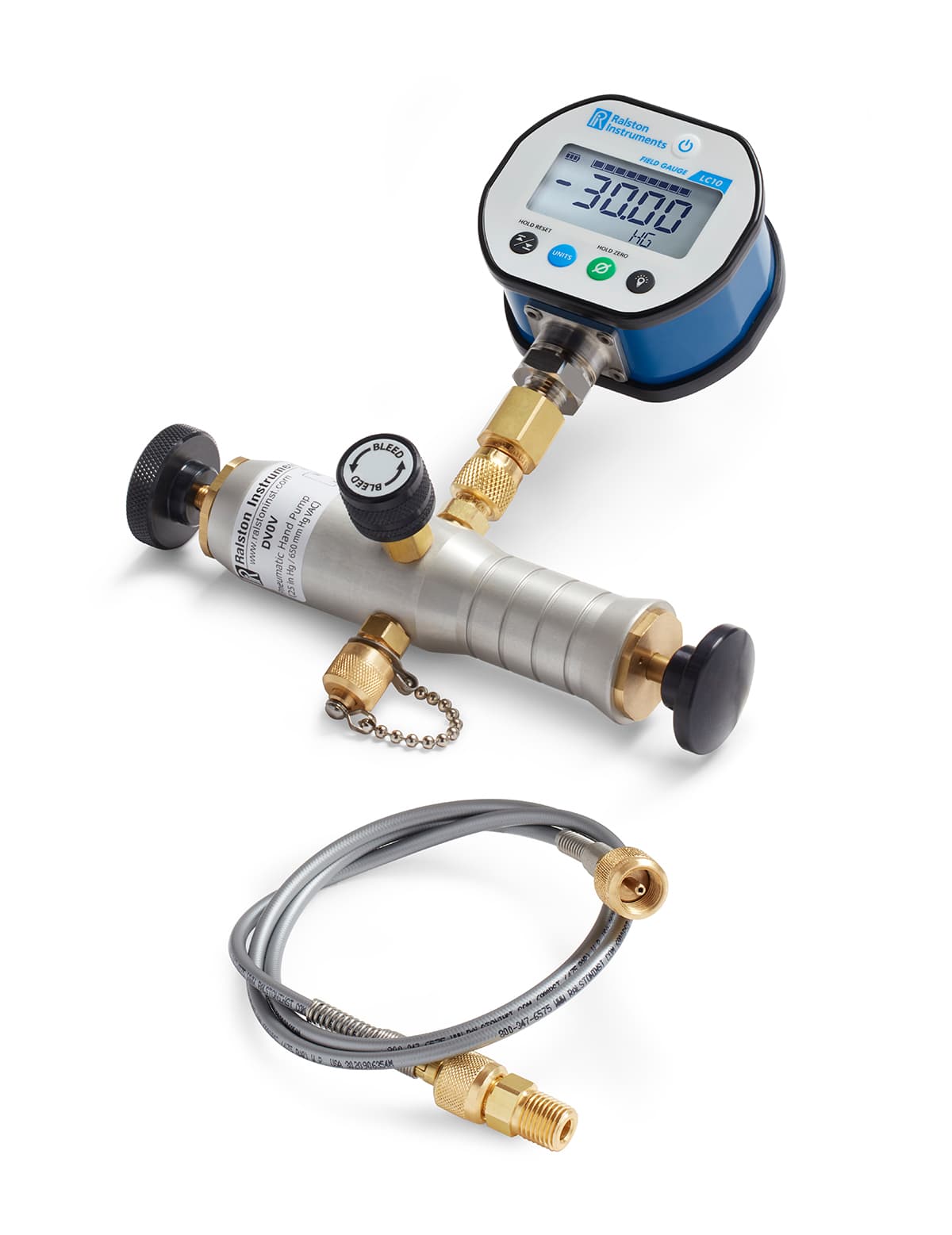 Create a vacuum and calibrate pressure devices with included vacuum pump and vacuum gauge